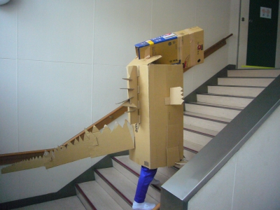 「はい!」と笑顔で作品の中に入り、ゴジラとなって学校を歩き回りました。