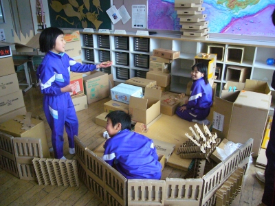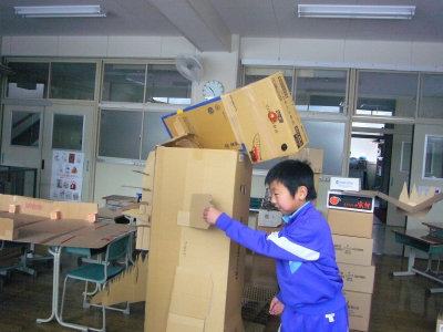 3年図工「だんだんだんボール」、4年図工「だんボール、切って、つないで」