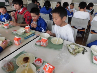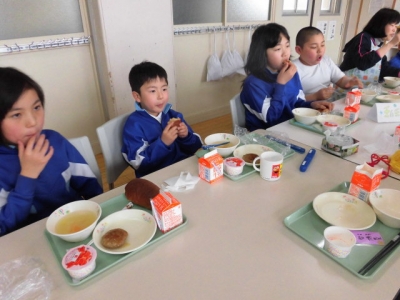 今日から1年生も給食を食べ始めました。ランチルームで全員がそろって