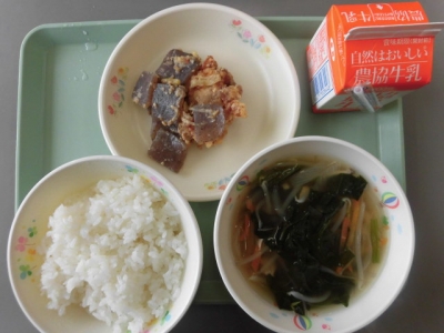 今日は、ごはん、牛乳、みそがらめ、ワンタンスープ でした。