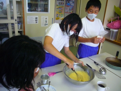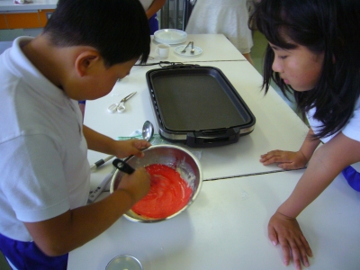 今日の活動は3~6年生が合同で,カナダのパンケーキ作りに挑戦しました。