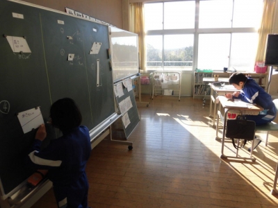 5年生は四角形の面積の求め方を各自考え図形を黒板にはっていきました。