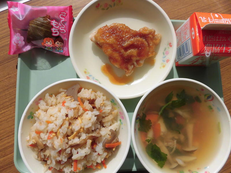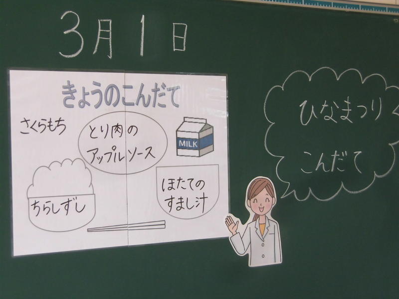 2019年3月1日 12時01分今日はひなまつり献立。ちらし寿司にホタテのすまし汁、桜餅など桃の節句を前に、季節感たっぷりの献立になっていました。