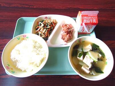 令和5年初めての給食…ごはん、牛乳鶏肉の塩こうじ唐揚げ②、生姜酢和え、豆腐とわかめの味噌汁です。