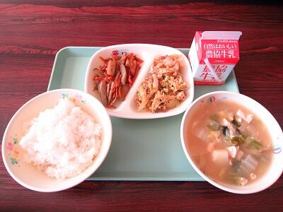 今日の給食のメニューは、ごはん、牛乳、油ふの卵とじ、ごぼうのおかか炒め、白菜のみそ汁です。