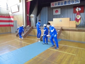 中学校の卒業式に向けて、式場の準備をしました。少人数の本校は、全校生、教員総出で準備を行いました。