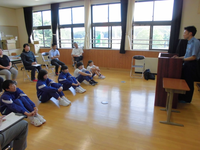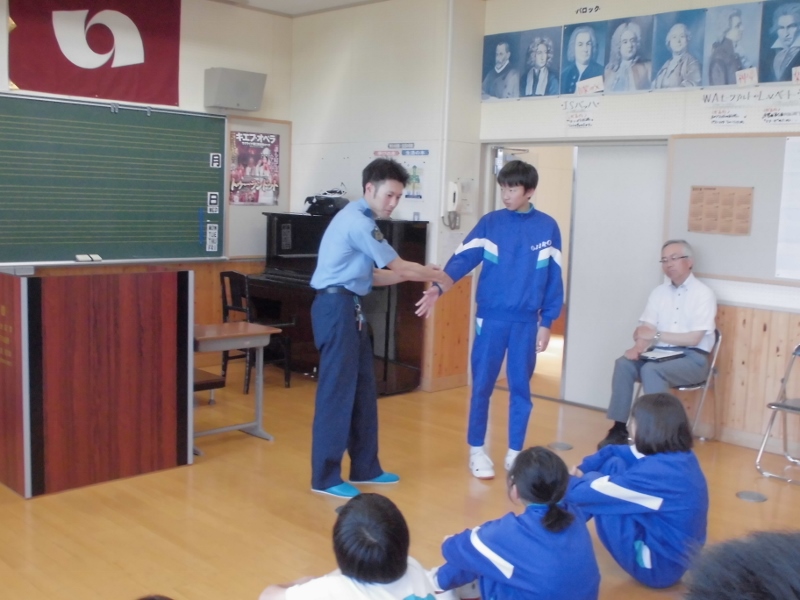 不審者役を川前駐在所のお巡りさんがしてくださり、迫力のある訓練を行うことができました。部屋に戻ってからの講義では、車の進行方向と逆に逃げるなどのポイントや、もし捕まってしまったときの振りほどき方など、詳しく教えていただきました。