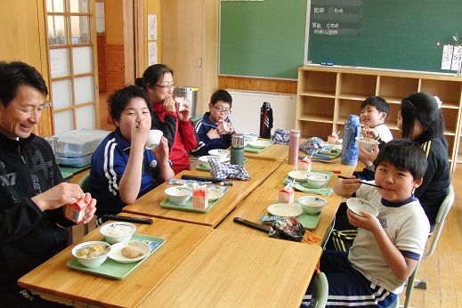白水小学校では、全校生と全職員(検食をする校長を除いて)がいっしょに給食を食べています。少人数のよさは、給食を食べる時の会話にも表れます。一人が話すと、みんなで聞く。そして反応して話す。そうしたことがごく自然にできて、つながりが感じられます。