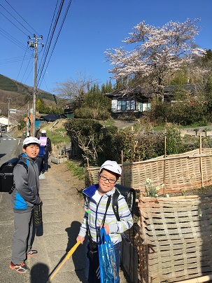 白水小学校では、毎朝、全校生が集団登校をしています。