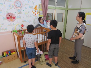 今日は、5年生児童が「総合的な学習」の時間に、近くの白水のぞみ保育園を訪問し、保育士さんの体験学習を行いました。