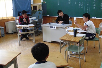 6年生児童は1名なので、討論する相手は校長先生、司会を教頭先生にお願いし、全校生で討論会の様子を参観することにしました。