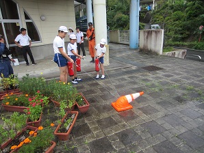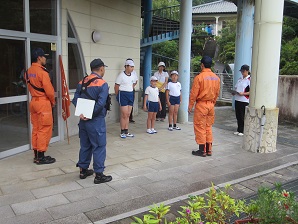 その後、昇降口の軒先に移動し、内郷消防署の方から自分の身を守るためにどんな行動をとったらよいかについてお話をいただきました。
