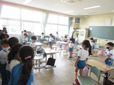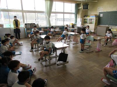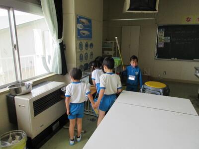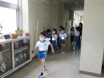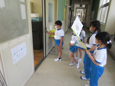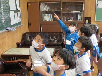 2年生が1年生に、「ここは保健室、けがをしたときに来るところだよ。ここは、職員室、先生がいるところ。…」と説明していました。2年生は、1学年お兄さん、お姉さんになってうれしそうでした。1年生は、興味を持って聞いていました。