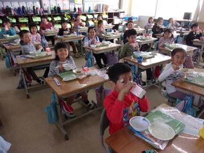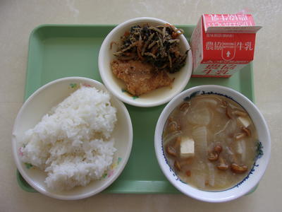 いわき市では毎月7日を「魚食の日」と制定しました。給食でも毎月1回、「常磐もの」を給食に取り入れています。今月の魚は、「さば」です。そして今日の給食は、ごはん、牛乳、サバの竜田揚げ、ほうれん草ののりごまあえ、なめこと大根のみそ汁でした。