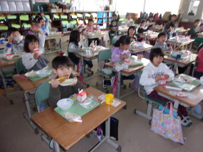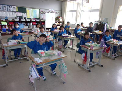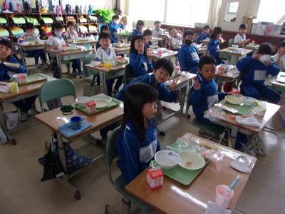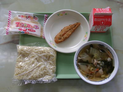 今日の給食は、郷ヶ丘小のリクエストメニューです。塩ラーメン、牛乳、笹かまのいそべあげそしてクレープでした。人気のメニューを、栄養のバランスを考えて選びました。みんな、笑顔で食べました。
