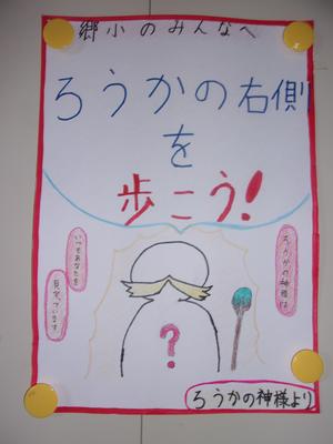 2階の廊下には、こんなポスターが貼ってあります。郷ヶ丘小には、ろうかの神様がいるんですね。学校が生まれてから100年以上が過ぎますが、子どもたちにとって学校の廊下を走らないということは、永遠の課題なのかもしれません。
