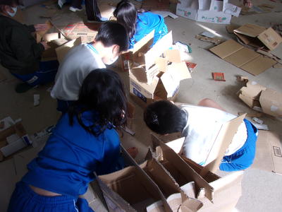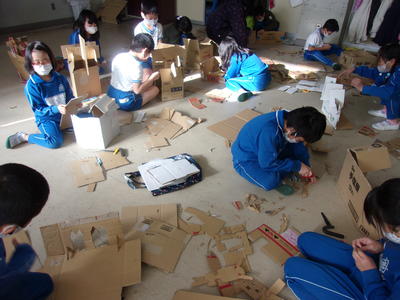 2時間目、3年生教室では図工の学習でした。内容は、「ダンボールに切り込みを入れて、いろいろな組み方を楽しもう」です。それぞれがダンボールカッターを使いながら、ダンボールを組んでいました。