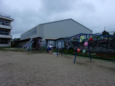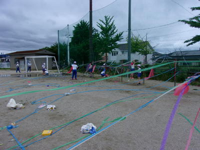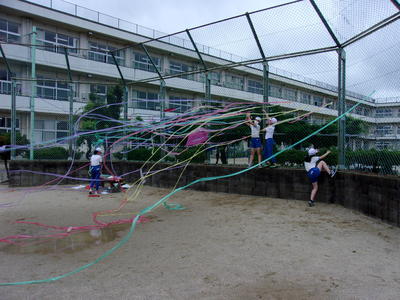 6年生は、図画工作科で風を感じての作品作りをしました。校庭の遊具等の施設を利用して、共同で作品作りを行いました。程よい風も吹いていて、作品がきれいに揺れていました。