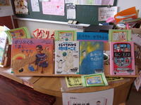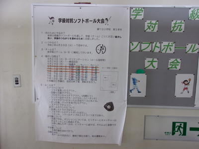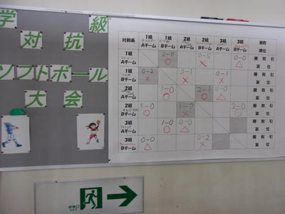 5年生の廊下には、体育で行っている学級対抗ソフトボール大会の勝敗表があります。現在のところ、2勝1引き分けの2組Aチームが首位のようです。どのチームもガンバレ!!!