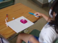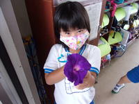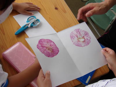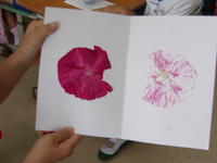 そして、授業の様子です。1年生は、アサガオの花でたたき染めを作りました