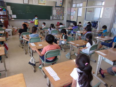 少し短い夏休みが終わり、今日から第2学期がスタートしました。朝は、お忙しい中PTAの役員の皆さんがあいさつ運動に立ってくださいました。いつも、本当にありがとうございます。子どもたちは、さすがに久しぶりの登校そして暑さの中だったので、学校に来るだけで大変な様子でした。それでも教室に入り、久しぶりに友達に会うと笑顔がたくさん見られました。放送で始業式を行い、その中で新型コロナウィルス感染防止に2学期も努めることと、それに伴う差別やいじめ偏見がないようにすることや、熱中症にならないよう気をつけることなどの話をしました。しばらくは暑い日が続くと思いますが、まずは生活リズムを取り戻すよう無理せず進めたいと思います。2学期は、少しずつ工夫しながら学校行事を行っていきたいと思います。夏休みの間、大きな事故やけがなく過ごせたのもご家庭や地域の皆様のご協力のおかげです。心より感謝いたします。2学期もよろしくお願いします。
