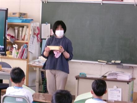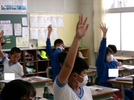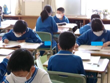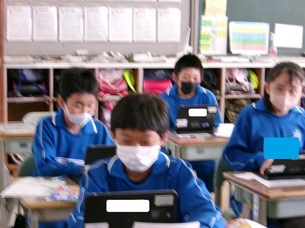 4年生の授業の様子です。算数では、自分の考えを進んで発表していました。国語では、調べ学習に集中して取り組んでいました。