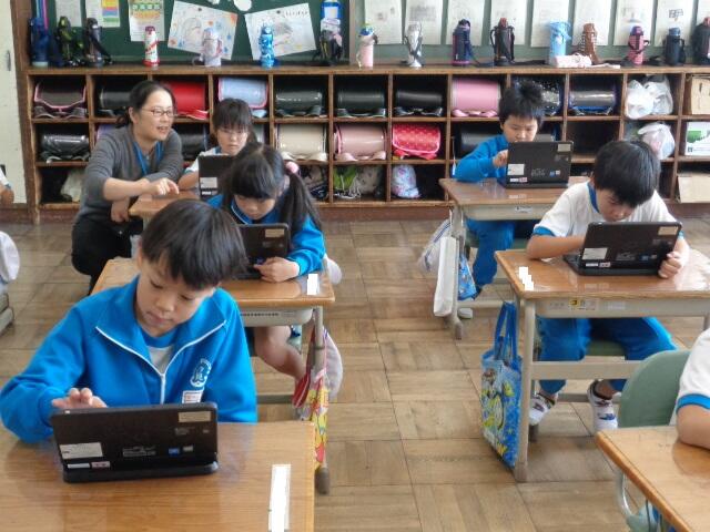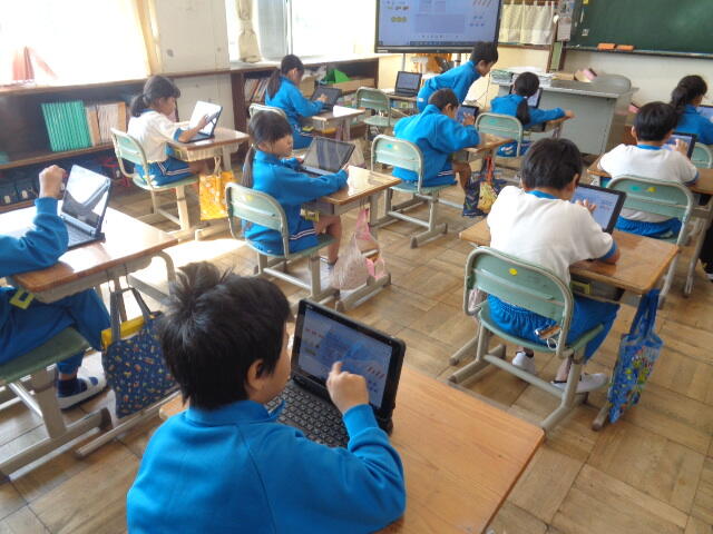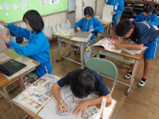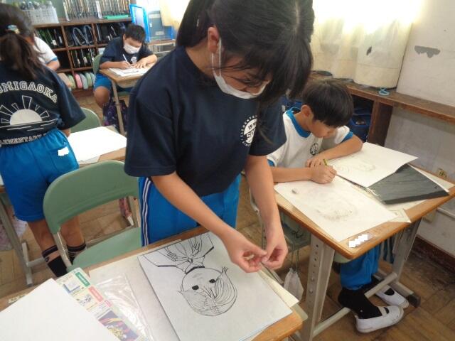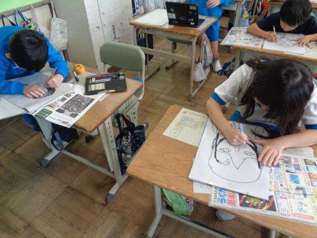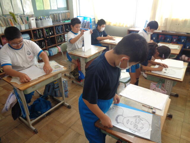 4年1組 図画工作科 タブレットで自分の顔を撮影して、用紙に書きました。完成が楽しみです。