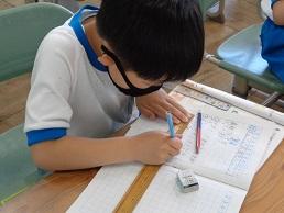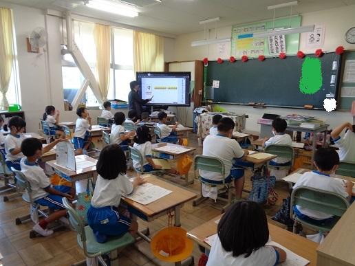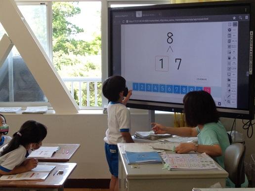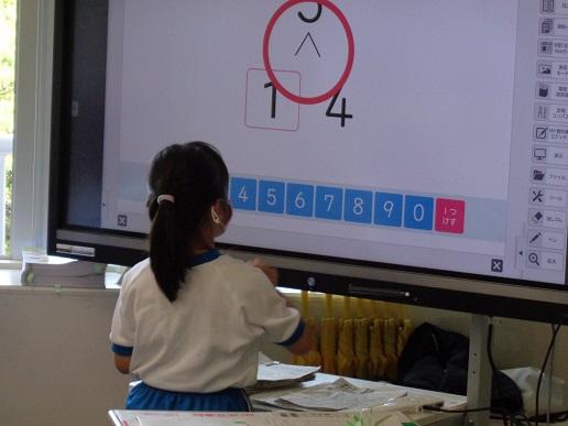 2年生は、直線の引き方の学習を行っていました。まっすぐに引くこつをつかんだようでした。1年生は、数の構成の学習を行っていました。「〇はいくつといくつ」の問題を素早く解いていました。どの学級も、電子黒板を活用していました。