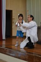 校長先生のお話では、「コアンダ効果」の実験パートⅡで、ドライヤーの空気の流れのバランスによって、小さな球体が浮く様子を見せていただきました。さらに、ストローの空気で球体を浮かせる実験を、各学年の児童の皆さんも交えて行いました。みんな必死でした。浮かせるコツは、息を沢山吸って、静かに長く一定の量を吐いていくことだそうです。これは、勉強にも言えることで、毎日少しずつ長く続けることが大切であるというお話でした。