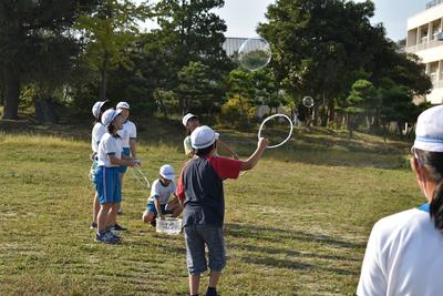 今日は、巨大シャボン玉への挑戦です。今回の活動で分かったことは、 水と洗濯のりと台所用洗剤の分量を正確にすれば成功すること。チャーミー系の洗剤を使うと透き通った虹色がでて、良い匂いがすることでした。次回はもっと大きいシャボン玉に挑戦してくだい。
