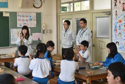 一方1年生教室では、給食試食会に引き続き、栄養教諭の新妻先生と鮎瀬先生をお招きして「食に関す指導」がありました。