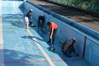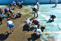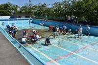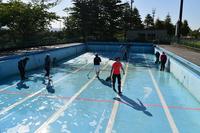 プールの底や壁はだいぶ泥などで汚れています。5年生と汚れとの戦いです。みんな一生懸命です。