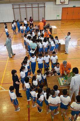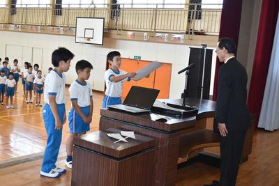 まずは、賞状伝達です。今回は、剣道大会の団体と個人の受賞です。汐見っ子は、学校生活以外でも活躍している様子がうかがえます。おめでとうございました。