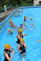 初泳ぎとして、流れるプールに挑戦しました。気温25℃、水温23℃で、とても気持ち良さそうです。3,4年生の主な学習内容は、「浮く運動」「泳ぐ運動」で、いろいろな浮き方やけ伸びをすること、補助器具を使ってのキックやストローク、呼吸をしながら初歩的な泳ぎを楽しく行うことをねらいとしています。これから短い期間ですが、安全面に気をつけて、伏し浮き、背浮き、くらげ浮きなどにどんどん取り組んでください。