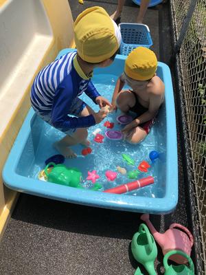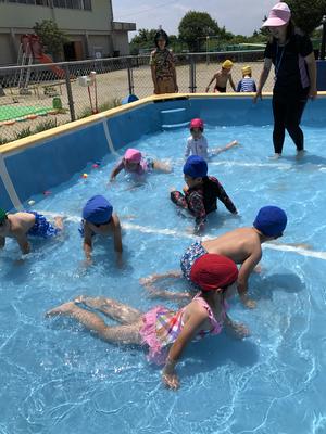 今年度はコロナ対策として、プール内での密を防ぐために入水人数を調整したり、クラス入れ替え時にアルコール消毒したり等しながら、水遊びを楽しめるようにしていきたいと思っています。