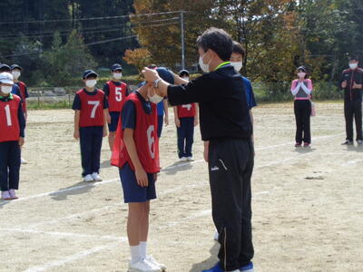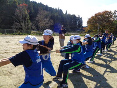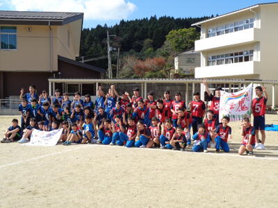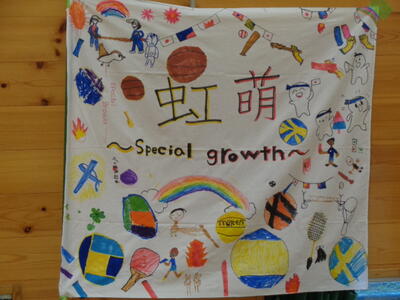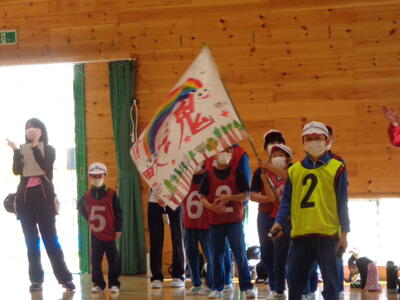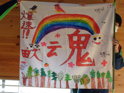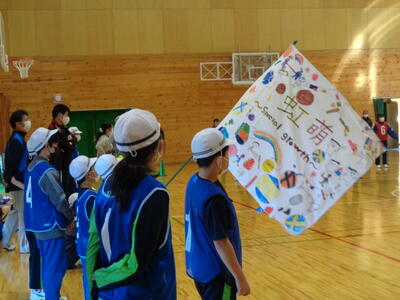 小中合同で2つにチーム分けをし、応援旗も作りました。