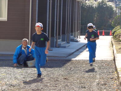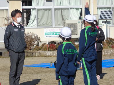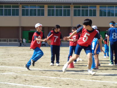 小学生と中学生が一緒に走ったり、小学生から中学生にバトンを渡したりする、