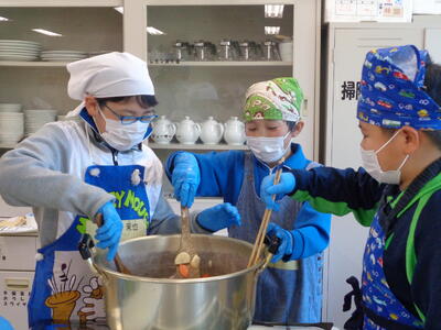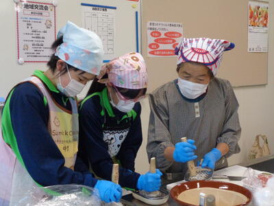 地域の方に教えていただきながら手際よく調理し、大きな鍋に苦戦しながらも、完成すると大喜びでした。