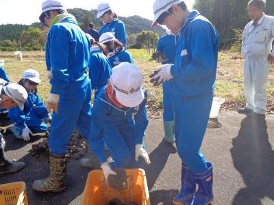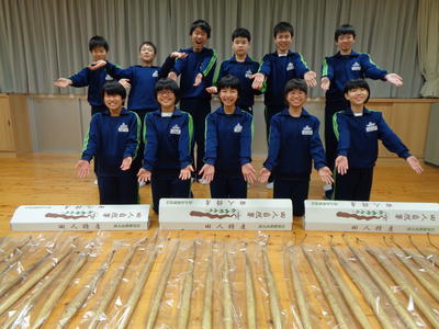 小学生が収穫した自然薯を、中学生が袋詰めにしました。まず、値段の基準となる重さを量り、丁寧に袋詰めします。立派な物には、贈答用にと箱詰めしました。