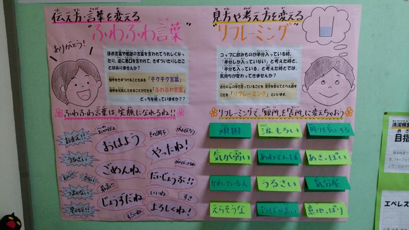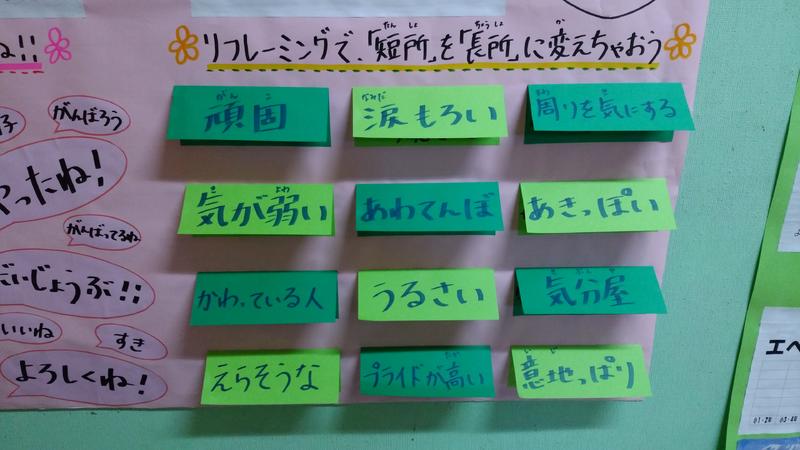 1つ目は「伝え方・言葉を変える」です。ものは言いようといいますが、言葉の力は大きいものです。伝え方一つで相手の気持ちも変わります。学校では「チクチク言葉」を「ふわふわ言葉」に変えようという授業もしばしば行われます。これを見て、大人の我々も、仕事や家庭、様々な場面などでぜひ心がけたいものだと実感しました。