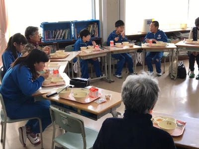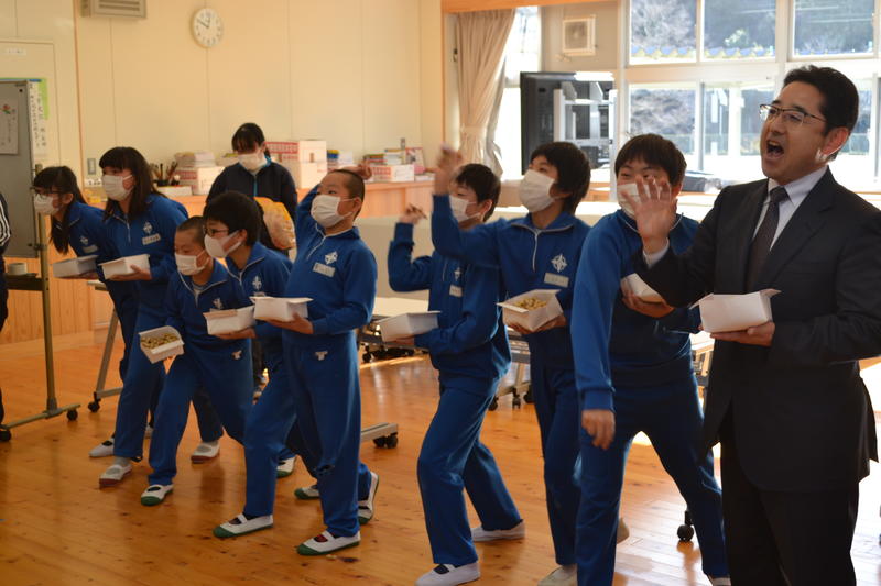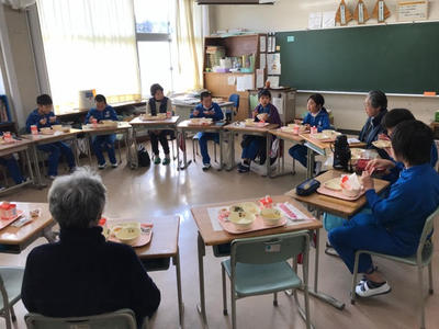 給食では、お世話になった4名の皆様と一緒に、おいしい給食とコンニャクの刺身を食べました。
