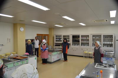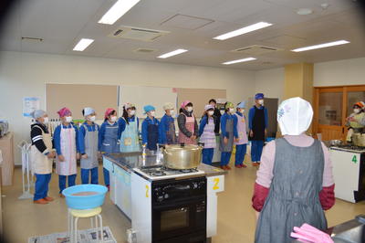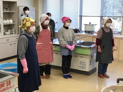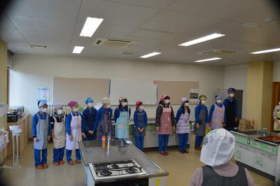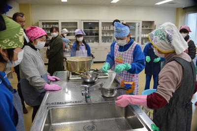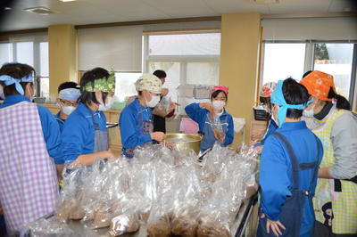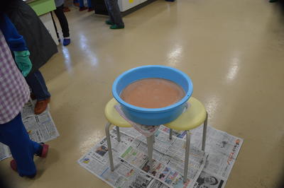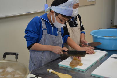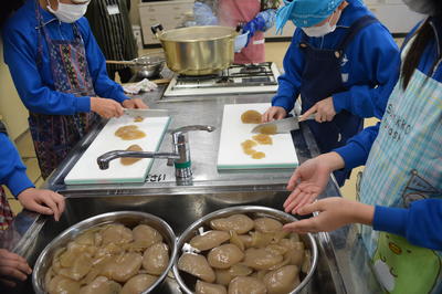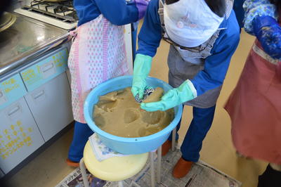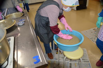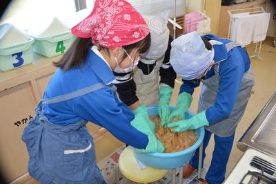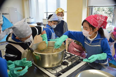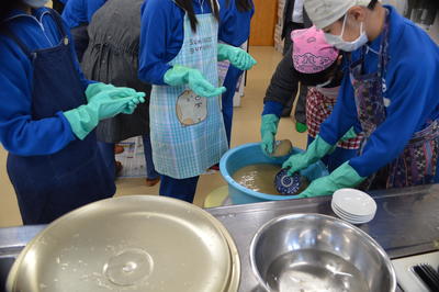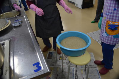 収穫できたたくさんの大きいコンニャク芋を、いよいよ、コンニャクにする作業です。5・6年生が体験しました。コンニャク作りでは、緑川さんはじめ4名の皆様にお世話になり、公民館の調理室で行いました。