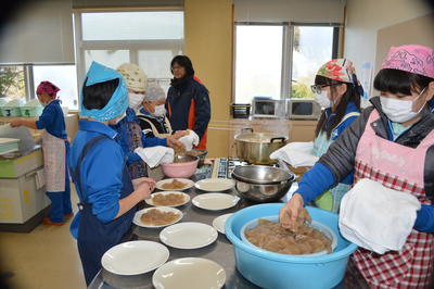 水を切ってお皿に盛り付けて出来上がりです。給食の時に、小・中学校の児童・生徒・先生方みんなに食べてもらいます。