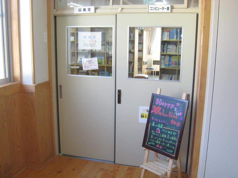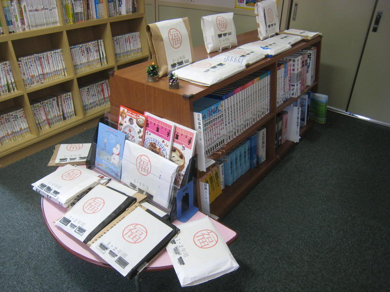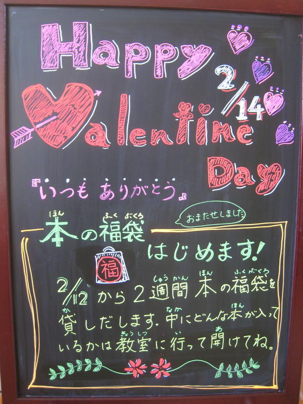 図書館司書の園部さんが、また、図書館の入り口にかわいい絵を描いてくださいました。図書館ではいま、福袋作戦の真っ最中、みんな楽しみにして図書館の本を借りています。