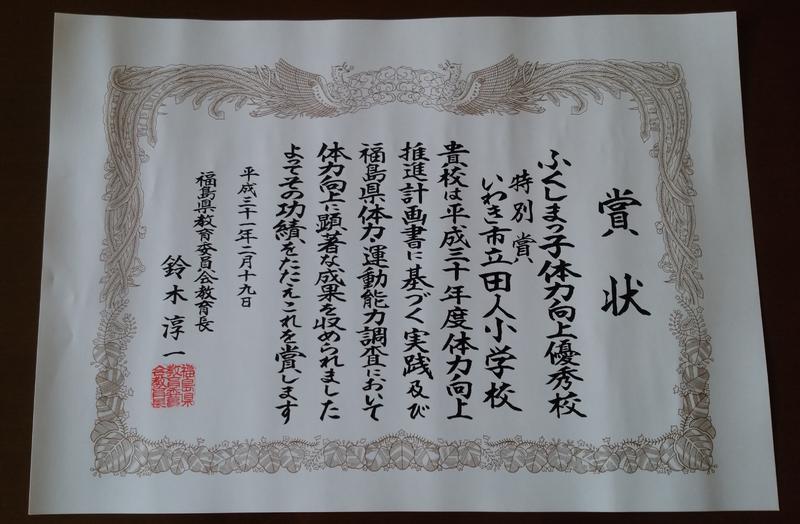 平成30年度ふくしまっ子体力向上総合プロジェクト事業「ふくしまっ子体力・健康優秀校表彰」におきまして、田人小学校が「ふくしまっ子体力向上優秀校・特別賞」を受賞することが決定し、2月19日(火)に福島市杉妻会館での表彰式において受賞してまいりました。