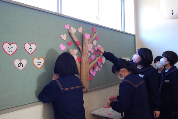 田人中学校に「ありがとうの木」ができました。友達、おうちの人、お世話になっている人たちへの感謝の気持ちが書かれています。外はまだまだ寒いですが、田人中には「ありがとうの花❀」が咲き誇っています。