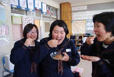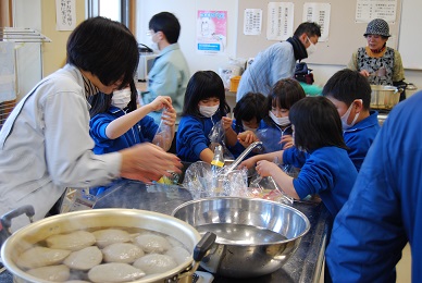 できあがったこんにゃくは、田人地区のこんにゃく屋さんで作っている"ゆず味噌”と一緒に小中学生全員に振るまわれました。のどごしがよくとても美味しくいただきました。地元の方々にたくさんのご協力をいただきありがとうございました。