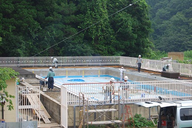 小学校のプールを深くして、中学生が使いやすくするための工事をしています。夏休み明けに、入れるように今週の工事がヤマ場となりそうです。あまり雨が降らないことを祈ります。