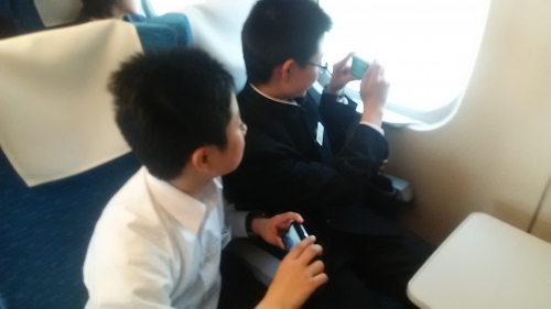 修学旅行三日目6 2017年4月14日 12時05分 清水寺見学も終わり、昼頃に京都を離れ新幹線で東京に向かっています。行きでは富士山を見逃してしまったのでカメラを構えてシャッターチャンスを待っています。