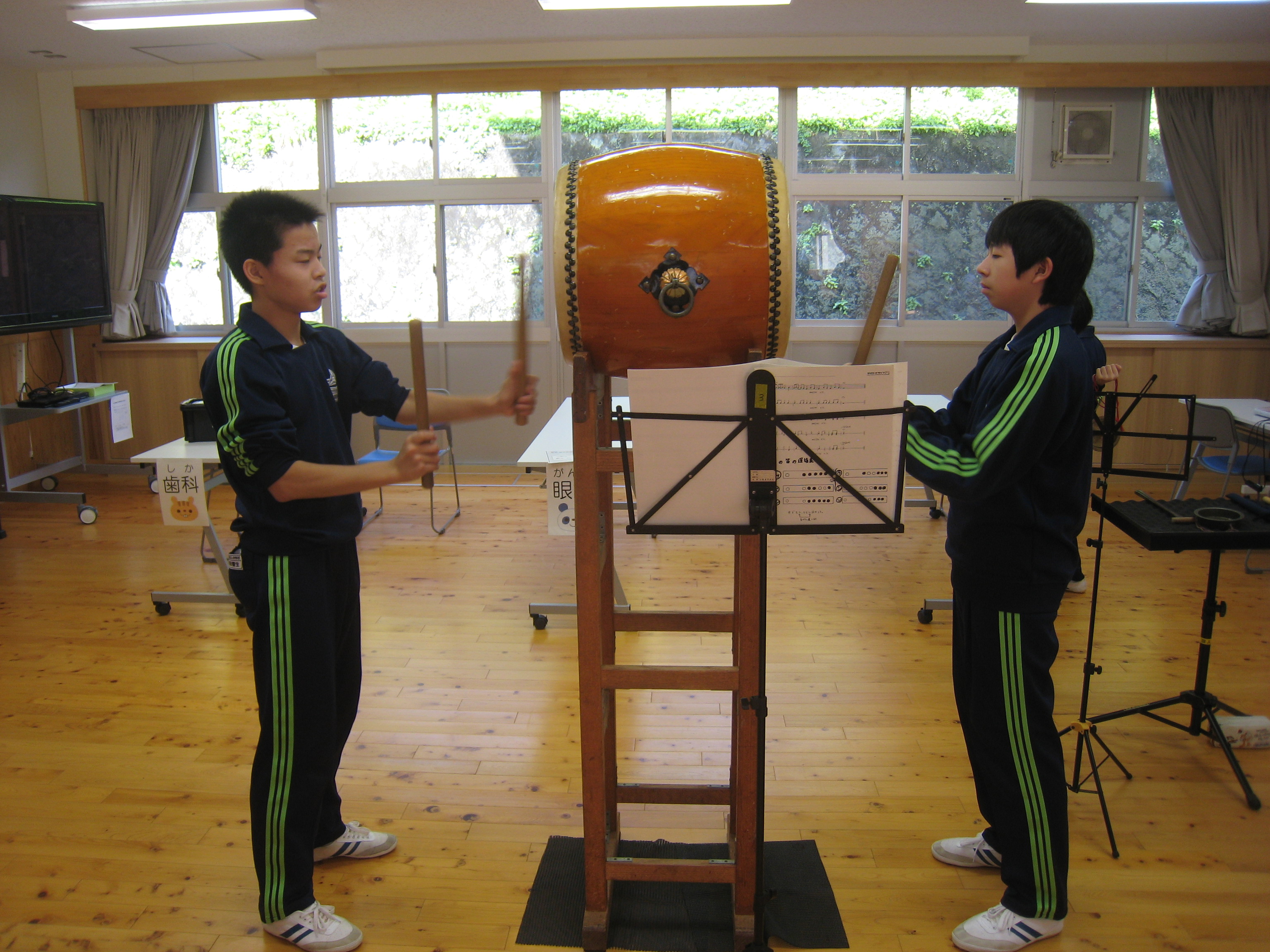 2018年10月26日 11時59分文化祭が終わったのもつかの間。次は、田人太鼓の練習です。「ほっこり祭」(田人地区復興祭)で田人太鼓を披露するため、3年生が1・2年生に熱心に指導してくれています。1・2年生も、一生懸命練習に取り組んでいます。